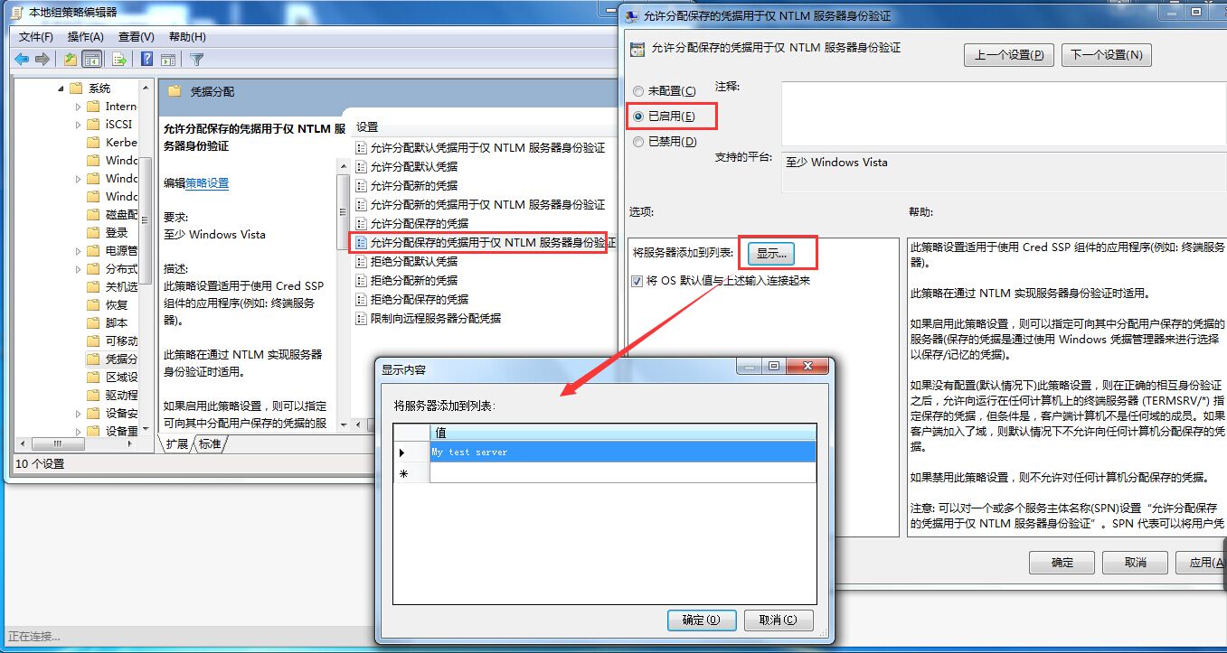 如何解决ECS 本地Windows系统远程登录提示“凭据无法工作” 本地电脑远程登录Windows 2008服务器遇到登录失败的情况,密码是对的,但是却登录不上,报错现象和密码不对还是一样。这可能是由于登录其他Windows服务器,本地电脑的凭据窜台导致的,可以尝试按照下面的方法进行设置。如下图所示: 1、 首先在本地电脑上运行gpedit.msc打开组策略编辑器,然后找到计算机配置->管理模板->系统->凭据分配->允许分配保存的凭据用于仅NTLM服务器身份验证->选择“已启用”,如下图所示: 2、然后进入“控制面板”->“用户账户”->“凭据管理器”->“添加Windows凭据”->输入Windows2008 Server的ip地址、用户、密码。再次测试登录远程桌面就可以了,如下图所示: 如问题还未解决,请联系售后技术支持。