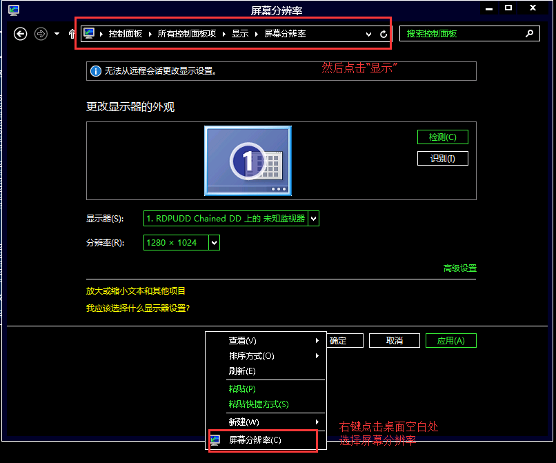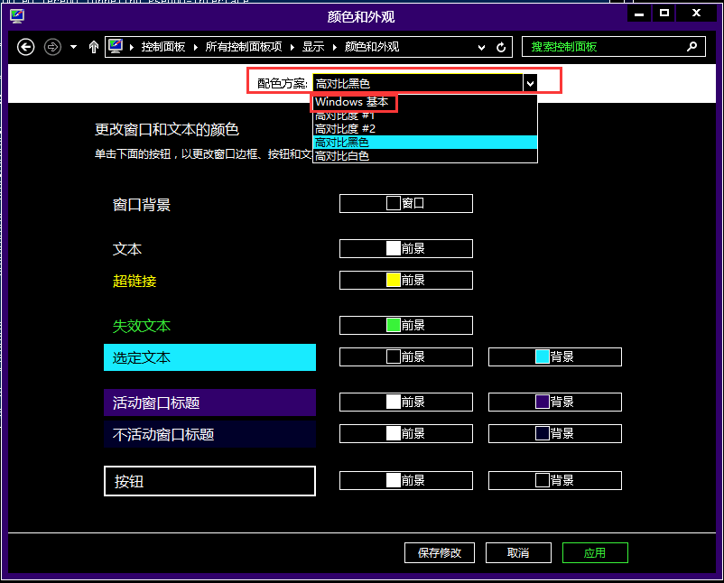 如何解决ECS Windows 2012系统登录后打开浏览器显示黑色 问题现象: 服务器上打开浏览页面是黑的,其他界面也是黑的,如下图所示: 解决方案: 首先右键点击桌面空白处,然后选择“屏幕分辨率”,在打开的界面中点击“显示”,如下图所示: 然后在如上界面中点击“显示”后就到了如下界面,选择左侧的“更改窗口颜色”,如下图所示: 打开后会显示如下界面,查看“配色方案”选择的是“高对比黑色”,然后在下拉列表中选择为“Windows基本”,再选择保存修改就可以恢复正常了。如下图所示: 如果问题还未能解决,请联系售后技术支持。