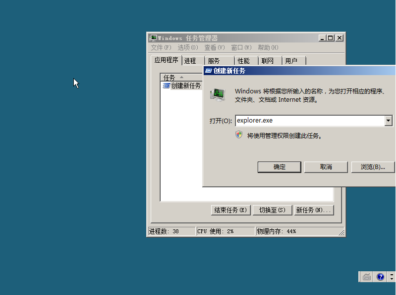 如何解决 ECS Windows系统远程登录桌面显示空白 问题现象: 服务器远程登录桌面内容显示为空白,没有任何桌面的图标显示。如下图所示: 操作方法: 这个时候我们可以通过管理终端链接服务器,管理终端使用方法用户可以参考:http://help.aliyun.com/knowledge_detail/5974445.html?spm=5176.7618386.5.7.dypXDQ ,使用ctrl+alt+del调出任务管理器,然后选择【应用程序】-【新任务】-【输入:explorer.exe 】点击确定就可以了,用户也可以通过浏览路径C:/windows/explorer.exe找到文件之后点击确定,也可以达到同样的显示桌面效果。如下图所示: 就已经可以正常显示,如下图所示: 如问题还未解决,请联系售后技术支持。