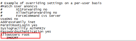 Linux服务器可通过在sshd_config文件中添加AllowUsers参数,可限制用户的登录,具体设置方法如下所示: 登录服务器使用命令vim /etc/ssh/sshd_config命令打开sshd_config,点击"i"切换到输入模式,新增一行AllowUsers(输入的位置没有限制,教程中在文件底部增加的信息),后面添加可跟账户名或IP地址,若添加多个信息,中间用空格隔开,输入后点击下"esc"退出编辑模式,之后输入:wq!保存退出,然后使用/etc/init.d/sshd restart命令重启下ssh服务,让配置生效,之后服务器远程ssh只允许sshd_config配置文件AllowUsers参数后面设置的用户进行登录,下图设置后,远程只允许root用户进行连接。