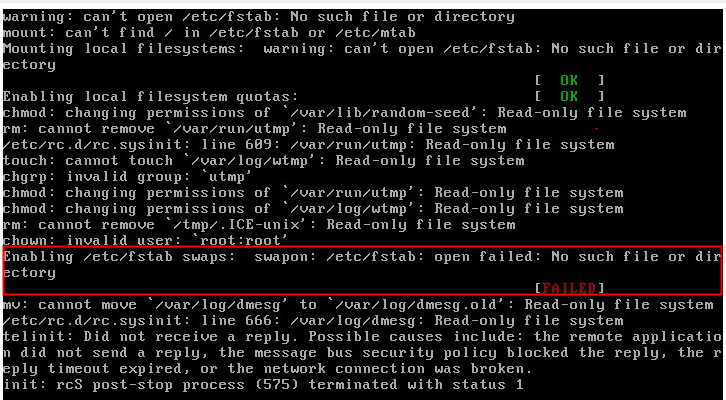 问题描述:阿里云ECS Centos 启动的时候,卡在启动进度条的最后一步,长时间等待仍不能进入系统。 分析解决:若出现类似情况,这个时候可按下键盘“ECS”键,会显示出命令终端的异常报错信息,然后根据报错信息,可以做进一步排查。截图示例如下所示: 上一条: ECS Linux因redis自启失败导致系统无法正常启动的解决办法 下一条: ECS Linux服务器ssh连接提示“Too many authentication failures for root”错误的分析解决