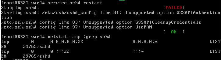 问题描述:ssh服务端口22监听不到,ssh服务启动提示“/etc/ssh/sshd_config line 81:Unsupported opeion GSSAPIAUthentication”错误