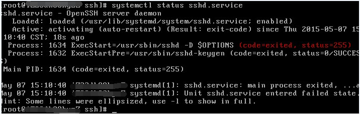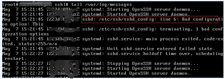 在连接管理终端登录服务器,可参考链接:http://help.aliyun.com/knowledge_detail.htm?spm=5176.7114037.1996646101.1.kwq7US&categoryId=8314844&knowledgeId=5974445&pos=1 重启SSH服务正常,无常规的报错status有报错,ssh的22端口没有正常监听,如图所示: 解决方法: 根据Linux的使用和维护技巧,可查看系统日志/var/log/messages,使用命令tail -n 10 /var/log/messages 根据日志中的提示信息,vi /etc/ssh/sshd_config 然后输入:回车,然后输入6,可找到第六行,查看其中的信息不正确,将其注释,使用systemctl restart sshd.service重启SSH服务就可以成功