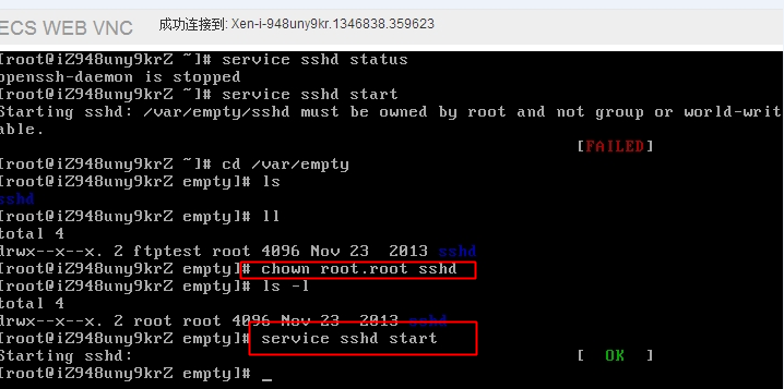 问题描述: ECS Linux服务器,用户通过Secure CRT等工具进行SSH远程连接的时候,报错远程端口没有开启。使用【连接管理终端】排查,发现SSH服务没有启动,尝试手工启动的时候,报错: Starting sshd: /var/empty/sshd must be owned by root and not group or world-writable.[FAILED] 问题分析:这个问题是因为sshd文件的权限或者属主被更改。可通过chown命令更改该文件所有者为root进行解决。 解决方法: 1、以root权限执行以下命令: #chown root.root /var/empty/sshd //更改sshd文件属主为root #service sshd start //启动sshd服务 2、使用远程工具重新连接该服务器,验证问题是不是解决。