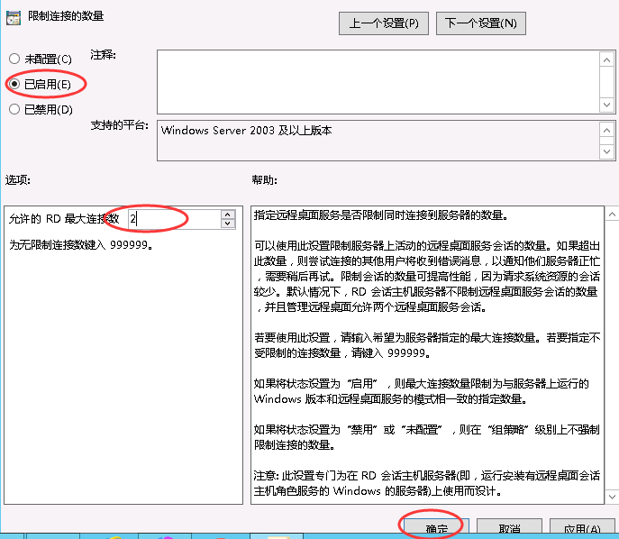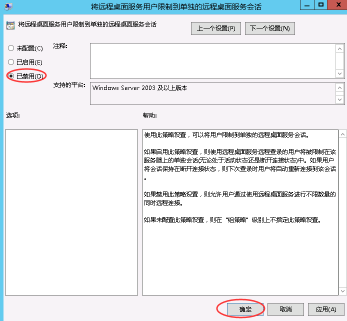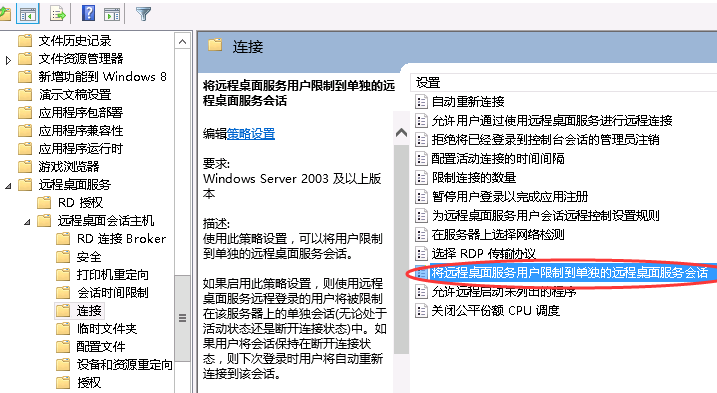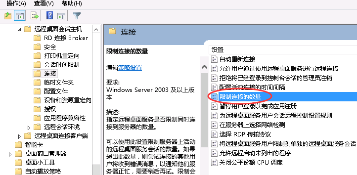 ECS Windows2012 实现多终端同时远程登录的具体方法 1.用户首先需要 登录到远程服务器,点击任务栏左侧【PowerShell】图标,调出命令行界面。如下图所示: 2. 然后执行“gpedit.msc”命令,打开【本地组策略编辑器】,依次展开【计算机配置】--【管理模板】--【windows组件】--【选择远程桌面服务】--【远程桌面会话主机】--【连接】。如下图所示: 3. 然后在【连接】界面,双击打开【将远程桌面服务用户限制到单独的远程桌面服务会话】,在弹出的窗口中选择【已禁用】,然后点击【确定】。如下图所示: 4. 返回【连接】界面,然后双击打开【限制连接的数量】。在【限制连接的数量】界面中选择【已启用】--【允许的RD最大连接数】填写要设置的最大同时远程用户数,设置完毕点击【确定】就可以了。如下图所示: 如问题还未解决,请联系售后技术支持。