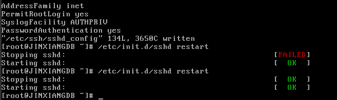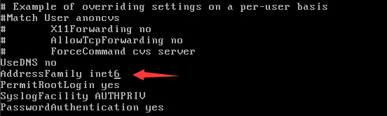 sshd服务启动后服务会自动停止,并且日志中没有明显记录 这个时候需检查sshd的配置文件/etc/ssh/sshd_config的AddressFamily 选项 这个选项代表指定哪个地址监听服务,选项值有"any", "inet" (IPv4 only一般设置这个就行了), or "inet6" (IPv6 only)可看到配置是inet6,服务器是IPv4地址,因此会出现无法监听的情况,需配置为any或inet 修改后再重新启动sshd服务查看已正常监听