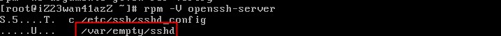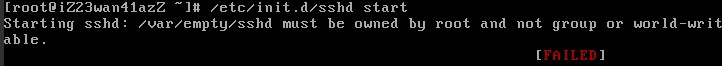 Linux系统的ECS上,使用命令:service sshd start 无法正常启动,提示“/var/empty/sshd must be owned by root and not group or world-writable.”错误 这个是因为权限错误导致的,检查/解决方式如下所示: 1、检查 ssh 是否运行中: /etc/init.d/sshd status返回:sshd is stopped 2、尝试手动启动服务,报错如下: /etc/init.d/sshd startStarting sshd:/var/empty/sshd must be owned by root and not group or world-writable. [FAILED] 3、使用rpm -V 命令检查ssh 软件包及目录是不是正常说我。 查询目录: rpm -V openssh-server 查询目录属主:ls -ld /var/empty/sshd/(此处输入sshd目录位置) 一般来说,这里可观察到目录属主并非root: 4、修改目录属主为root:chown root /var/empty/sshd/ 5、重启sshd:/etc/init.d/sshd start一般就可以解决问题了。