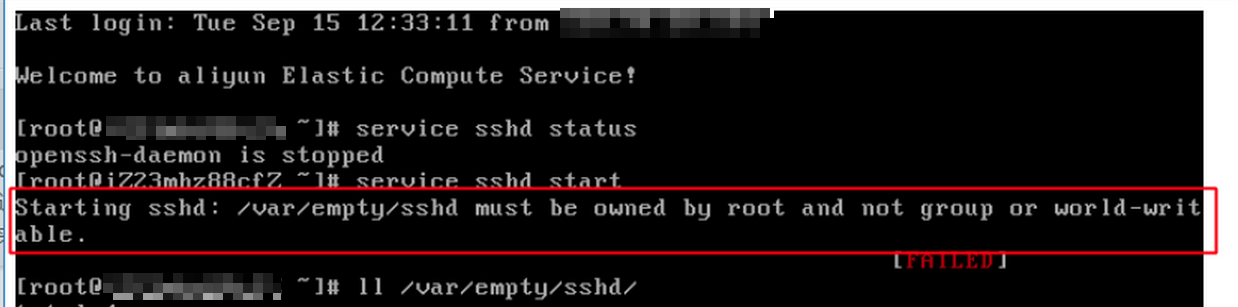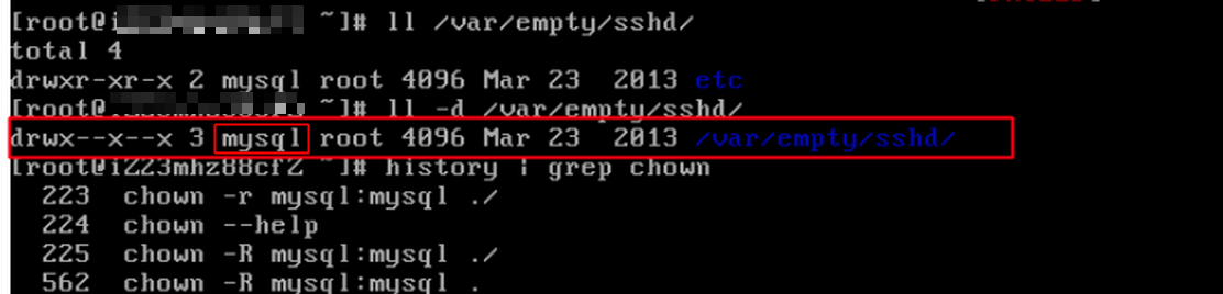 用户使用SSH连接ECS Linux服务器的时候失败,telent ssh端口(默认22)也不通。 用户使用【管理终端】进入服务器后,尝试重启SSH服务时,出现如下图错误: Starting sshd: /var/emtpy/sshd must be owned by root and not group or world-writable. 这个问题通常是因为用户误操作或者系统被恶意入侵后,相关系统目录属组被修改。 如下图所示,本案例中,系统目录/var目录的属组被修改成了mysql: 用户可尝试通过如下方式修改相关目录属组来进行恢复: 使用【管理终端】进入服务器; 以/var目录为例,使用如上指令修改回默认属组: chown -R root:root /var 尝试重新启动SSH服务或者其它问题服务。