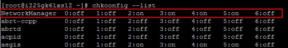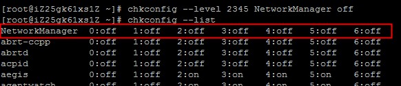 Linux服务器不能远程连接,通过WEBVNC方式远程连接服务器查看外网网卡配置改变,外网IP丢失或变成了内网IP,常见于安装了VNCSERVER和图形界面的服务器 修复方法: 1.执行chkconfig --list命令检查NetworkManager是不是开机启动: 2.若该服务为启动状态,执行service NetworkManager stop停止NetworkManager服务。 3.执行chkconfig --level 2345 NetworkManager off禁止NetworkManager开机启动: 4.执行/etc/init.d/network restart重启服务器的网络检查。