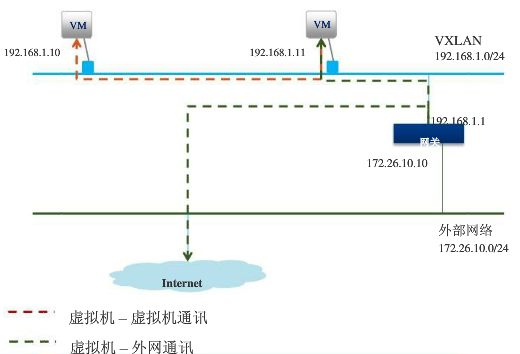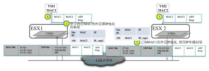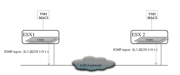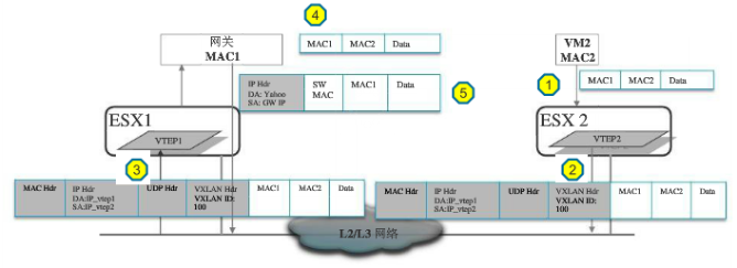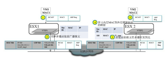 VXLAN传输数据包 VXLAN虚拟可扩展局域网是一种overlay的网络技术,使用MAC in UDP的方法进行封装,在封装包中间添加了一层共50字节的VXLAN Header,然后以IP数据包的形式通过3层网络进行传输。位于VXLAN安全加密链路任何一端的虚拟机不知道这个封装包。同时,物理网络中的设备也不知道虚拟机的源或目的MAC或IP地址。VXLAN的封装结构如下图所示: 1、 VXLAN Header: 共计8个字节,目前被使用的是Flags中的一个标识位和24bit的VXLAN Network Identifier,其余的部分没有定义,但是在使用的时候必须设置为0×0000。 2、 外层的UDP报头: 目的端口使用4789,但是可以根据需要进行修改。同时UDP的校验和必须设置成全0。 3、 IP报文头: 目的IP地址可以是单播地址,也可以是多播地址。 单播情况下,目的IP地址是VXLAN Tunnel End Point(VTEP)的IP地址。 在多播情况下引入VXLAN管理层,利用VNI和IP多播组的映射来确定VTEPs。 从封装的结构上来看,VXLAN提供了将二层网络overlay在三层网络上的能力,VXLAN Header中的VNI有24个bit,数量远远大于4096,并且UDP的封装可以穿越三层网络,因此比的VLAN更好的可扩展性。 VXLAN协议网络工作原理 1)、网络初始化 在VXLAN协议工作前需要进行网络初始化配置。网络初始化就是让虚拟网络中的主机(如阿里云主机)加入到该播组。例如:VM1和VM2连接到VXLAN网络,那么二台VXLAN主机(ESXi1和ESXi2)就需要先加入IP多播组239.119.1.1。VXLAN的网络标识符(VNI)就是网络ID。 2)、ARP查询 下图描述了VXLAN协议中二个连接到逻辑2层网络的虚拟机(VM1和VM2)ARP查询流程。 1、 VM1以广播形式发送ARP请求; 2、 VTEP1封装报文。本例中,VXLAN 100关联在IP多播组239.119.1.1中,VNI为100; 3、 VTEP1通过多播组将数据包发送给VTEP2; 4、 VTEP2接收到多播包。VTEP2将验证VXLAN网段ID,拆封数据包,然后将通过2层广播包的形式其转发到虚拟机VM2; 5、 VM2收到广播包后发送ARP响应。 请注意:VTEP1只会在VTEP转发表中没有虚拟机MAC与该MAC地址的VTEP IP之间的映射时,才会生成多播包。在广播数据包时,如果MAC转发表中没有与帧目的MAC地址相匹配的条目,2层交换机会执行ARP查询操作。在发现虚拟机MAC地址与VTEP IP地址的映射条目并将其更新到转发表中后,任何与该特定虚拟机通信的请求都将通过点到点安全加密链路传输。 3)、ARP应答 ARP应答处理流程类似于ARP请求,不同之处在于VM2将通过单播包进行ARP响应。因为VTEP2已经获得了VM1的MAC地址、IP地址以及VTEP1的信息。VTEP2将建立一个转发条目,以后交换数据包操作会使用该转发条目。 4)、VXLAN网关 若需要VXLAN网络和非VXLAN网络连接,必须使用VXLAN网关才能把VXLAN网络和外部网络进行连接。下图描述了VXLAN网关的工作原理: 1、 VM2通过网关MAC地址向网关发送数据包; 2、 VTEP2封装数据包,通过多播(第一次)发送给VTEP1; 3、 VTEP1拆封数据包,并发送到网关; 4、 网关将IP数据包路由到Internet。 案例(一) 当二台虚拟机在同一逻辑2层网络中时,如果二个虚拟机都在同一台vSphere主机上,那么数据包无需封装。若二个虚拟机在不同vSphere主机上,一台vSphere主机上的源VTEP将虚拟机数据包封装到一个新UDP标头中,并通过外部IP网络将其发送到另一台vSphere主机上的目标VTEP。 案例(二) 图中显示了二个虚拟网络VXLAN-A和VXLAN-B。二个网络分别属于192.168.1.0/24网段和192.168.2.0/24网段,二个网络通过VXLAN网关进行连接。以下是可能情况: (1)、当所有虚拟机和VXLAN网关位于同一vSphere主机上时。虚拟机将流量导向各自逻辑网络子网的网关IP地址,VXLAN会根据防火墙规则在二个不同接口之间进行路由。 (2)、当所有虚拟机不在同一台vSphere主机上,而VXLAN网关部署在其中一台vSphere主机时。虚拟机的流量将被封装到数据包,然后进过物理网络传送到VXLAN网关,之后将由网关将数据包路由到正确的目标。 (3)、当所有虚拟机和VXLAN网关不在同一台vSphere时。数据包传输将类似于情况2。 应用于 了解VXLAN(virtual Extensible LAN虚拟可扩展局域网)技术 上一条: 网络虚拟化(三):VXLAN虚拟可扩展局域网(上) 下一条: 虚拟化小子迎娶白富美Hadoop秘籍