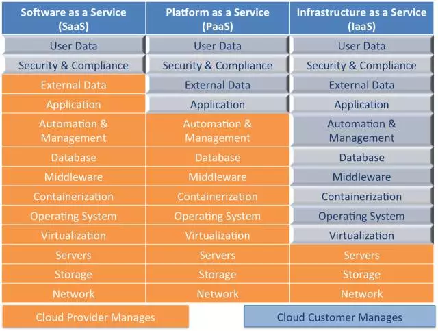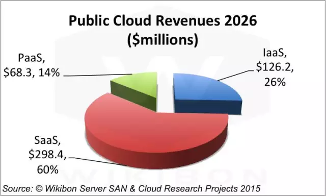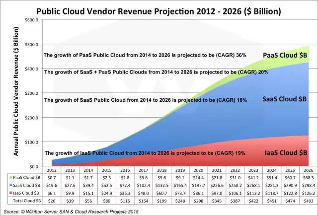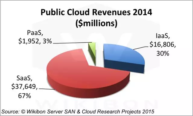 从四张图看未来十年的公有云市场 Wikibon的最新报告《Public Cloud Market Forecast 2015-2026》中提到:从2015年到2026年,全球公有云市场规模将保持20%的复合增长率,2026年达4930亿美元。其中,PaaS、SaaS、IaaS的年度复合增长率分别为36%、18%和19%。 从2012年开始算起,综合分析预测出从2015年到2026年公有云服务商的营收增长变化。 上面这张图全面展示了公有云从上到下的堆栈元素,从SaaS、PaaS和IaaS层,用户的自主权越来越大。 下面两张图则分别展示了2014年公有云市场各部分收入,并预测了2026年的市场情况(这张图里的单位应该是Billion哈~)。 通过以上分析不难看出这几个趋势: SaaS一直会是最大的盘子,发展趋于成熟稳定 PaaS潜力最大,迎来发展机遇期 IaaS厂商变化不大