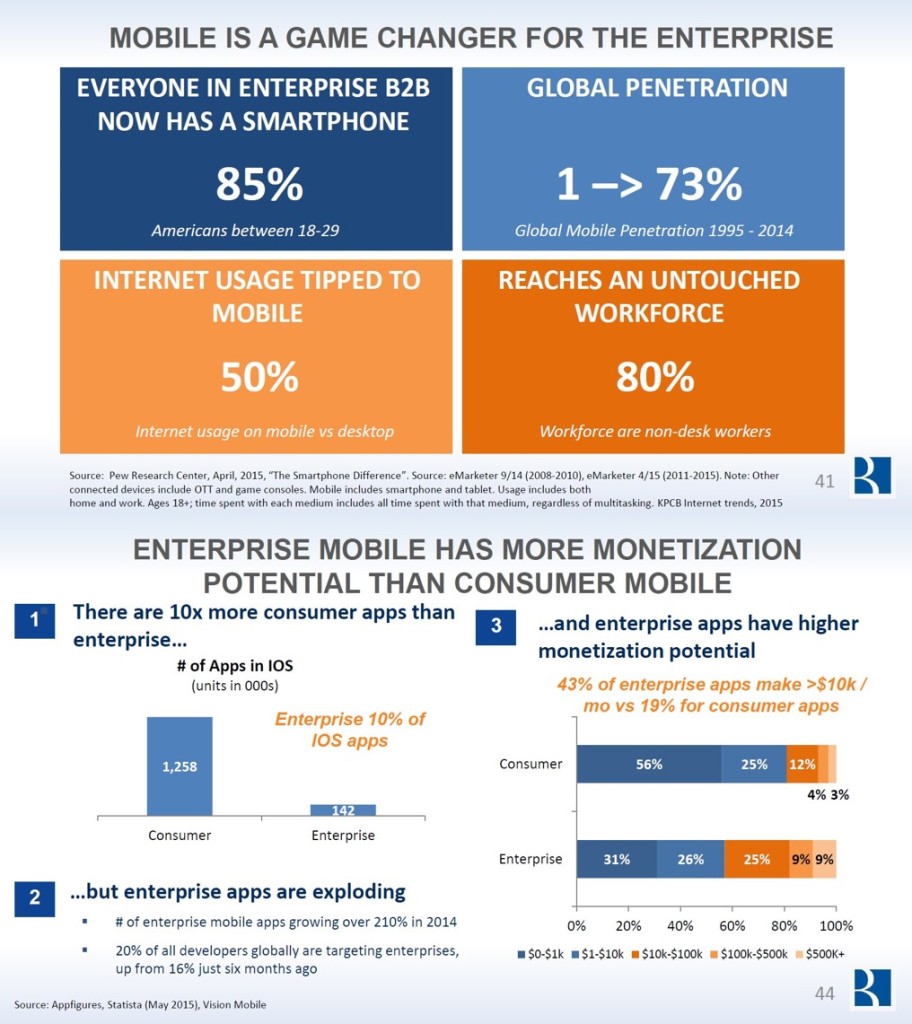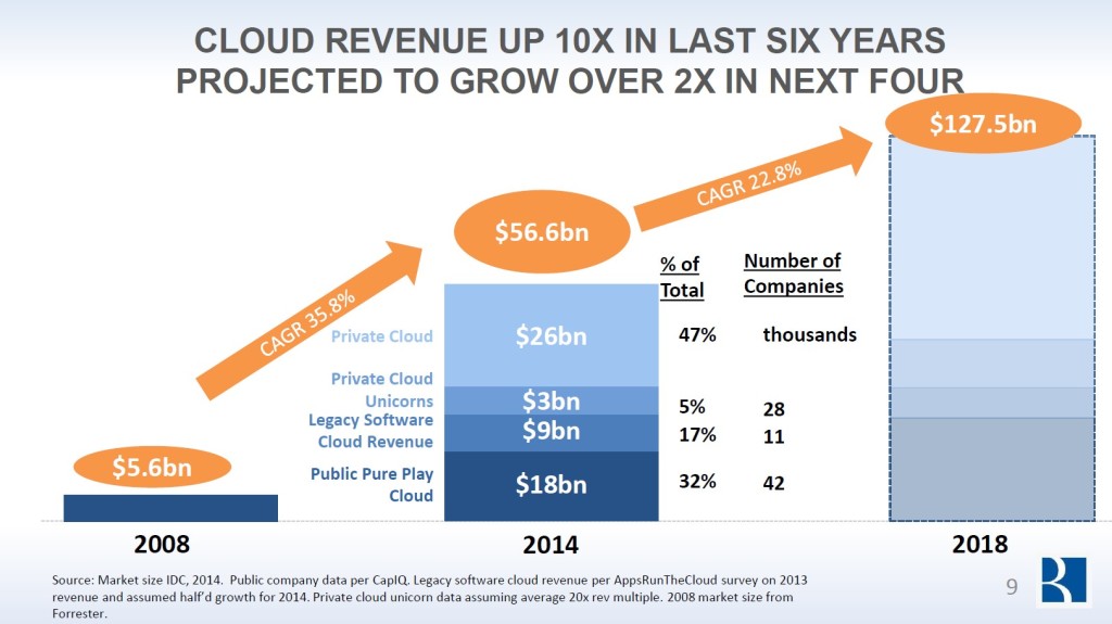 2018年超过半数的CRM将基于云,云计算市场份额将达到1275亿美元 我们在之前的文章中,已经对云计算市场未来3年内的增长预估,认为从2014年到2018年内云计算市场将以年增长率22.8%的速度进行增长。企业对于SaaS应用的支出已经接近所有应用之初的30%,预计将以17.6%的均年增长率增长至2018年。 以这样的发展速度,到2018年,62%的CRM软件将是基于云计算的,来巩固其市场地位。 来自Byron Deeter的State of the Cloud Report 2015中显示云的应用还处于初期阶段。许多的研究也证实他们的结果,认为云计算市场仍然在一个初级阶段中。 下面我们来看一下来自Byron Deeter的研究报告: 云计算市场正以22.8%的年均复合增长率增长,并预计在2018年将达到1275亿美元,而这一数字在2014年底则是566亿美元,其中最大的花费是在私有云上(260亿美元)。 SaaS花费保持这一个稳定的速度在增长。预计到2018年30%的应用将是基于SaaS的应用。SaaS应用目前的年均复合增长率从2013-2018年间将达到17.6%。而本地软件开发的计划则以每年2.8%的年均速度降低。 在本次的预测中认为到2018年62%的CRM软件将基于云计算。从2013-2018年,预计基于云的CRM将以年均增长率19.6%增长。Saleforce在预测中依旧将成为该行业的领头羊。 下图所示的是通过BVP 云指数来预计三到五年的市场,可以看出在BVP云指数预测中到2020年云市场将达到5000亿美元的市值。BVP运指数在2010年至2014年已经达到了64%的年复合增长率。而下图也提供了各种可能的发展方案的概述。Bessemer 认为中间蓝色的以25%的年增长率增长的预测是最可以达到的。 Bessemer在本次研究中提出了6个关键指标来定义云计算的商业价值随时间变化的值。这六个指标包括年度经常性收入(ARR),% ARR增长,保留/向上销售,客户获取(CAC)回报,%毛利率和燃烧率/自由现金流(FCF)。其中ARR 和ARR增长率是最重要的指标。Bessemer还发现,一个强大的向上销售策略,可以抵消客户流失的负面影响,并量化了这项研究。 在2015年内垂直聚焦云计算的商业市值达到了252亿美元。企业深耕于垂直市场与快速提供新的应用程序的能力能够为企业赢来更快的更多的新客户,而这也会导致在垂直市场信誉的增加最终导致更高的市场估值。 移动端对云计算市场的增长和应用程序开发的影响越来越大,而企业移动相较于个人用户具有更多的潜在力量。80%的员工并没有在办公桌上工作加上目前广大互联网使用的正是来自移动设备。智能手机的全球普及率现在73%。从报告以下两页提供在流动性方面的Bessemer的调查结果的概述。