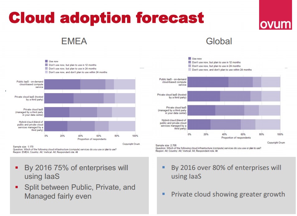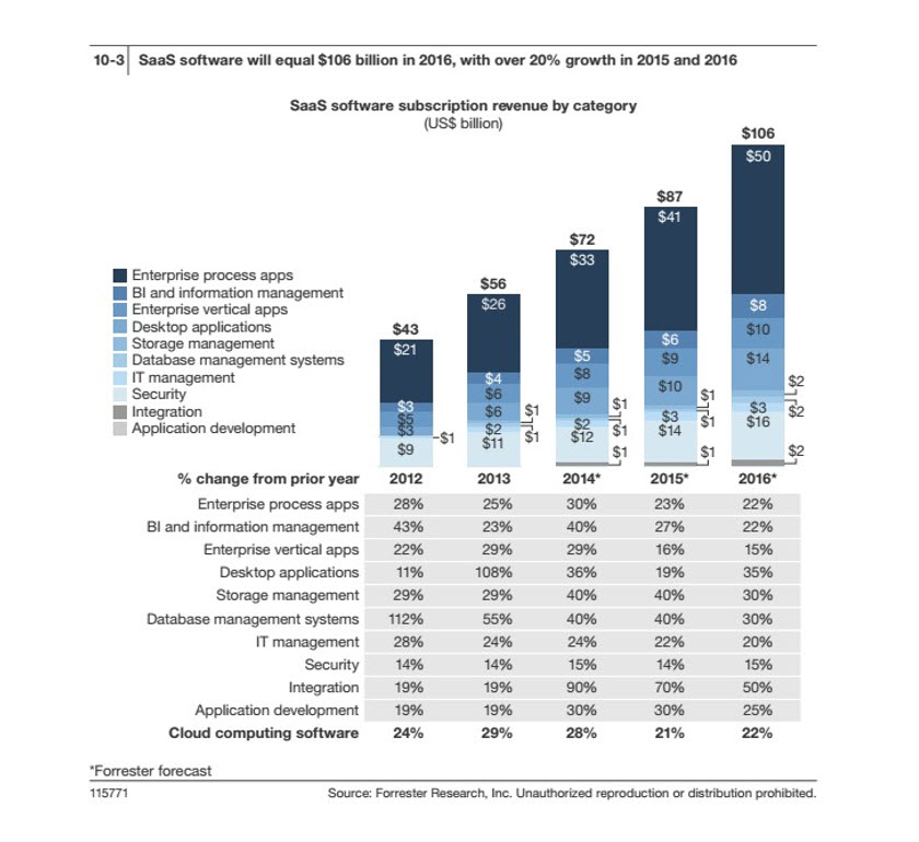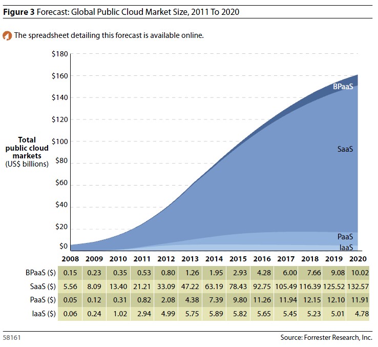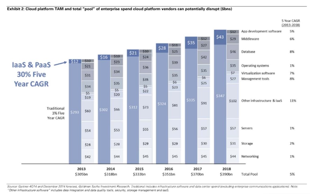 关于云计算市场的预测分析汇 随着云市场如火如荼的发展,所以越来越多的人开始对云市场充满了好奇与期待。目前全球的SaaS软件营收预计在2016年将达到1060千亿美元;预计在2015年内SaaS平台的开支水平将增加21%。高盛研究在本月发布的报告中指出,在云计算基础建设以及云平台上的花费将在2013至2018年间以年均增长率30%的速率增长,而整个IT行业的预计增长仅有5%。 面对这个蓬勃发展的市场,许许多多的咨询公司和研究机构都对云计算市场有着不同的预测。但是他们都一致认为在全球范围内云计算的发展正在加速。 下面是综合了最具代表性的一些分析结果: 思科预计到2018年,总的云服务将从2013年的41%来自于SaaS增长发展到59%都来自于SaaS服务。思科还预测到2018年,Iaas在总的云负载中的比例将从2013年的44%降低到28%。除此之外,13%的云负载将来自PaaS,相比2013年的15%会有所下降。 来自Centaur Partner的分析SaaS以及云计算的商业应用服务收入将从2011年135亿美元增长到2016年的328亿美元,实现19.5%的平均年增长率。 Computerworld则预测,42%的IT决策者都在2015年增加了云计算的开支,而在拥有超过1000员工的企业中这个比值则更大,达到了52%。2015年排名前五的科技支出如下图所示: 来自Forrester的预测指出,在2016年全球的SaaS软件营收预计能够达到1060亿美元,预计将比2015年整体增加21%。而企业花费在一体化、存储管理和数据管理系统的花费预计将在2015年经历最大的增长。 到2015年SaaS将产生784.3亿美元的收入,而预计到了2020年这个收入将增长到1326亿美元,年平均增长率达到9.14%。下图是Forrester的全球公有云计算市场规模分析与预测(2011-2020)。 预计到2018年云计算基础构架和平台的开支将以30%的年均增长率增长,而相对的整个IT行业的预计年增长率仅有5%。来自高盛的预计,亚马逊已经达到了40亿美元的年收入,或者过去12个月内,获得了26%的IaaS和PaaS市场份额, Network world预计在2015年内,安全(占36%),云计算(占31%)和移动设备(28%)将是IT企业的Top3花费。 IDC预计到2016年,会有11%的IT预算将从传统的内部IT交付转向云计算这种新的模式。到2017年,35%的新应用将使用云功能,这将加快开发运维的生命周期,以此来简化新功能和新业务的推出。在另一个文章中IDC预测到2018年,公有云的开支将会增加一倍以上,从而达到1275亿美元。在这其中,827亿美元开支来自于SaaS,246亿美元来自IaaS,最后的203亿美元来自于PaaS。同样是来自于IDC的预测,IDC认为到2018年,全球企业应用软件市场的27.8%将是基于SaaS的,而这将产生508亿美元的收入,比2013年增加226亿美元。同时IDC也给出了2013年整个企业应用软件市场的预计是1358亿美元。 Ovum预计到2016年,全球范围内80%的企业都将使用IaaS,而投资私有云上会呈现比较大的增长,而在EMEA地区的企业将有75%使用IaaS。 微软的商业云计算收入在第三季度内增长了128%,而服务器产品和收入仅增长了13%。 埃森哲预计到2018年SaaS的供应链管理(SCM)市场预计将达到44亿美元,实现从2014到2018平均年增长率为19%。 企业的云订阅收入预计2018年将达到670亿美元,年平均增长率达到17.3%。