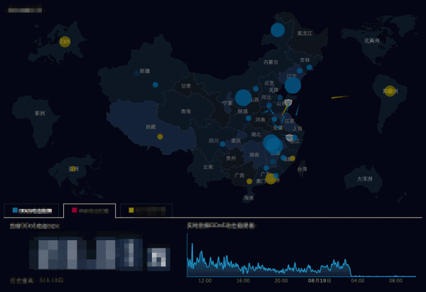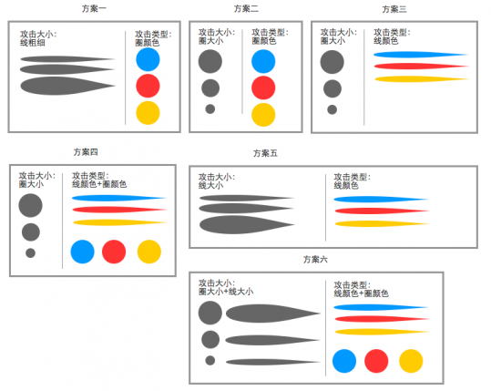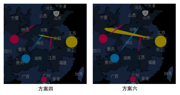 如图12所示,在考虑使用世界地图还是中国地图的时候发现业务上,国内攻击很多,然而国外很少。而且只需要看到的国内的能到地级市,国外的到洲或者国家就行了,最后我们创新除了第三种,以中国为主的世界地图来展现。 形状—攻击点,保护点,方向:作为体现情感的重点体现,可以对保护点做盾牌的形状;攻击点用普通的用户能第一时间理解的感觉到的形状比如圆(因为数量过多时展现最为清晰);用有方向感的连线连接攻击点与保护点来表示方向。 大小,颜色——怎么来处理呢?放在哪个维度上表现呢? 圆的视觉冲击力最强,可以清晰的同时表现大小和颜色。所以把方案一、三、五排除掉了。 在数据量很大的情况下,会有很多线出现,这是很难分清楚这些线是那些哪个线,线需要有颜色区别。因此排除方案二。 现在只剩下方案四和方案六: 从图15可以看出:方案六的情况下在看圆的时候会受连线粗细的干扰,连线之间也会被遮住从而干扰视线,因此确定用方案四。 确定好了这些表现方式之后,对每个表现方式做数据量化变现和动效的处理: 小插曲:在设计动效的时候还想通过动效的节奏来体现攻击量的大小,比如频率越快,表示的攻击的量越大,后来实现中发现这样画面会更加的杂乱。 结论:每个维度,只用一种表现。即清晰又易懂。 第4步、检查测试 1.REVIEW需求:过一遍需求是不是能够满足。 2.实地测试:将效果放上大屏,看是否方便阅读,动效是否达到预期,色差是否能接受。 3.可信性测试:当自己的讲解员,给用户讲解大屏。能否一句话描述大屏,同时用户能够理解。 设计大屏一定是一个长期跟进的过程。在真正数据进来了,放在大屏上显示有很多问题才能发现。 在这个屏中我们改过的细节: