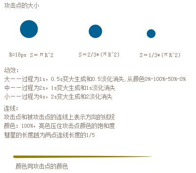 接下来是对每个阿里云数据的chick,知道每个数据代表什么,用什么展现最好。 从和业务沟通了解到,他们需要地图,top10,饼图,列表,数字,趋势,这些图表。这些能满足他们目前所有的需求。 但是如果在多有的屏上都只放这些元素,展现上会缺乏很多心意,业务差别性也不好体现。所以需要对每个需求再剖析。 第2步、拆合分析 在这一步,需要着重做以下几点,帮助我们分析,理清思路。 (1).拆分维度:将需求拆分到最小维度 (2).确定优先:选择最佳数据来说明观点。 (3).合并维度:对维度元素进行归类,化繁为简。 (4).最佳表现:确定用哪种表现形式来体现数据。 案例:在做这一系列的具体某一个屏时A业务需要大屏展示的内容:我们的业务针对特定区域的保护,正在实时防御着世界各地多类型的攻击。能看到每个攻击类型的当天累加值与趋势。 对于这个内容,我们首先进行拆分维度。你们能看到多少维度呢?(一定要拆到最小维度) 因为重点要表达的是我们防住了这些攻击——表达这种自豪的情感。所以我们在来确定这些维度的主次优先级。 看这些主要的维度有没有可能进行合并呢?对这些信息进行相似度归类,化繁为简。关联性最多的维度用同一种颜色表示,画出所有的关系。 如图6表示,所有的维度互相关系。我们可以发现时间维度和所有的内容都有联系。但是时间又是个隐形的内容,大屏上的数据为了表示紧张性,时间如果是实时展现的。那么这个维度在设计的时候不必要用某个具体的视觉元素来表现,是通过在时间节点上的动效变化来表现的。所以我们把这时间线去掉看效果。 效果虽然清爽了不少,但是线还是很交错的不方便阅读和理解需要。对交错关系的维度进行位置的调整。 攻击类型:他和次要维度都有关联。 攻击仿效:和保护点和地狱有交错。 我们可以看到在主图的关系中,攻击点是所有维度中关联性最强的。供给量与攻击类型可以是他的属性。地狱是攻击点和保护点的属性。 这样重点就是攻击点到被攻击点的过程了。 各类型日累计量可以通过计数器来表达。各攻击趋势可以通过趋势图来表现。剩下的就是这么来设计这张地图了。 第3步、规划设计 在第二步的时候已经将大部分分析工作都做完了,现在要做的是如何对这张地图来表达我们的想给来宾传达的信息。 在这块主要是细节和感受的设计。设计顺序: 1.模块设计:长久考虑的模块纵横栅格布局设计还是不顾延展性把只为这一个屏的精致。 2.维度表现:具体维度用什么表现的确定。 3.动效设计:时间的把握和情感的控制。 4.数量控制:对实施数据的不可控性进行展现上的控制。考虑页面最后出现的时候太密或太疏是用户的感受。 大屏和其他显示屏一样,本身都有固定分辨率的。一般都是4*3的比例。在设计时考虑到通用性,可以优先考虑1024*768的分辨率。如果设计师追求更加极致的表现,可以根据每个大屏本身的像素块的多少来设计。比如:1400*1050或者5600*3150 考虑到同系列的屏幕会有相同展现形式,使用相同组件,可以对大屏进行栅格。 大屏是横纵都固定的,可以采用横纵都12栅格的方式。 在第二步中我们已经确定只要重点在地图上表现出不同纬度:地域,攻击点,保护点,方向,攻击大小,攻击类型。 这些内容要运用到数据可视化的知识。 基本的表现形式有:大小,位置,形状,颜色 对每个表现进行思考: 位置-地域:显而易见。但是什么样的地图符合我们的场景呢?