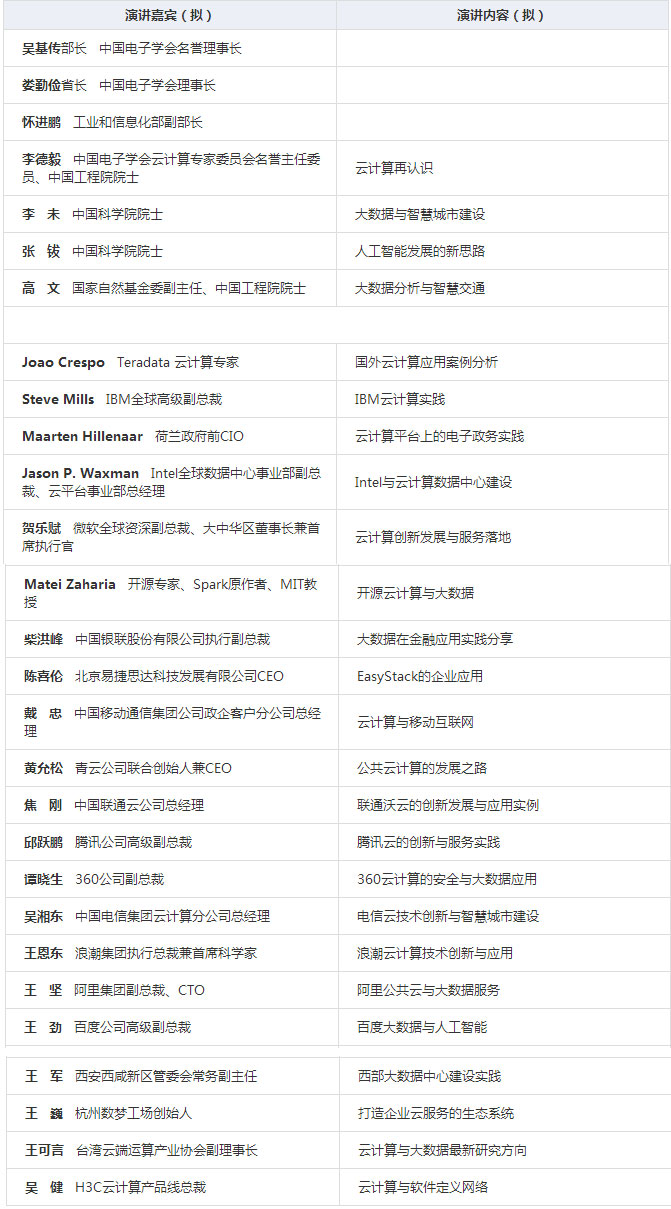 第七届中国云计算大会和首批主会演讲嘉宾和议题公布 由CSDN协办的第七届中国云计算大会于2015年6月3日-5日在北京国家会议中心举办。目前主会演讲嘉宾名单和议题方向已经公布,众多中国科学院/中国工程院院士、BAT云技术领军人(阿里巴巴集团副总裁/CTO 王坚博士、百度高级副总裁王劲、腾讯高级副总裁邱跃鹏)、三大运营商云计算负责人、Spark原作者Matei Zaharia、中国银联执行副总裁柴洪峰、青云联合创始人兼CEO黄允松等嘉宾届时都将带来精彩演讲。现在仍处于票价八折期(4月25日-5月15日),有兴趣的朋友可以通过官网【购票报名】。 本次大会历时四天,6月2日为大家安排的是多场实战技术培训,包括: Docker实战技术 企业高管商业变革实战策略高端培训 Hadoop 2.0运维管理与集群安全监控 除此之外,SaaS产业发展论坛、IFIP云计算专家委员会全体会议、第二节国际云计算标准化论坛、第七届海峡两岸云计算合作论坛,这四场封闭会议也将在6月2日举行。 除了主会演讲,在6月4日、5日的下午,主办方为大家精心筹备了十场技术专题论坛和行业应用论坛。主题包括: 大数据核心技术与应用论坛 云计算平台构建与实践 云计算核心技术架构论坛 云计算安全与可信计算论坛 “互联网+”高峰论坛 “互联网+”下的远程医疗建设与实践论坛 云计算IT基础设施与自动化运维 云计算大数据与互联网金融论坛 混合云应用与实践论坛 云计算大数据智能交通行业应用论坛 在全体大会上,主办方安排了一系列重磅的主题演讲: Matei Zaharia Matei Zaharia在加州大学伯克利分校AMP实验室念博士的时候设计和编写了第一个版本的Spark。同时,作为Spark社区的灵魂人物,他担任MIT教授,同时也是大数据公司Databricks的联合创始人、CTO。他将在演讲中为大家带来开源技术在大数据公司应用实战的案例。 黄允松 青云QingCloud联合创始人及CEO,Eclipse Committer。在IBM实验室度过了九年的职业生涯,主要精力贡献给了开源世界,先后投身Eclipse、Hadoop及Linux的开发,现在是云计算。曾为IBM SmartCloud初创组成员及架构师。 王坚 阿里巴巴集团副总裁、首席技术官,王坚自2012年8月起担任阿里巴巴集团首席技术官。他于2008年9月加入阿里巴巴集团出任首席架构师,直至担任现职为止。2009年9月阿里云计算成立起至2013年9月,他亦曾任该事业部的总裁。加入阿里巴巴集团前,王坚曾任微软亚洲研究院常务副院长。在1999年加入微软亚洲研究院之前,他曾任浙江大学心理学系教授兼系主任。 ......更多详细信息,请关注官网的持续更新。 附第七届中国云计算大会全体大会议程(拟)