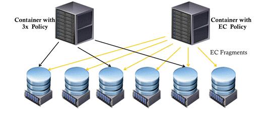 下面是一个swift.conf文件的示例: 图2 完成swift.conf 文件的编辑后,下一步是为每个存储策略创建相应的Object Ring,方法与创建老版本 Object Ring类似,只是要在object 后面加上"-N",这里的 N 是存储策略的编号。例如,为上述编号为 0和1的存储策略创建Object Ring: 2.使用存储策略 存储策略的使用非常简单,仅需要在创建 container 是指定存储策略即可,下面以 SAIO 部署来说明: 图4 图5 这说明 Storage Policy 已经成功发挥作用。 三、存储策略的应用模式 上面提到副本数量的改变,这只是存储策略的应用模式的一种,在实际应用中,可以有以下几种模式: 1. 缩减或者增加冗余 对于一些数据,它们不需要保证很高的数据持久性与可靠性,比较典型的是图像的缩略图,它们可以由原图降采样得到,这种情况下,可以对原图采用三副本方案,对缩略图采用双副本方案,降低存储系统的开销。 如图6所示为不同的 Container 指定不同的副本数量 图6 2. 性能分层 例如,一些数据用 HDD 保存,另一些用 SSD 保存。也可以应用于其他存储介质,甚至是不同的存储设备。 如图7所示为不同的 Container 指定不同的存储介质 图7 3. 地理位置约束 在某些场景下,因为公司或国家的政策的约束,某些数据必须存储在指定的地理位置,例如混合云场景。在有些场景下,用户希望指定数据存放在距离访问客户端比较近的地方。 如图8所示为不同的 Container 指定不同的存储位置 图8 4. 应用纠删码(Erasure Codes) 对于那些性能要求不高的场合,应用纠删码。纠删码,又称为删除码,将对象分割为 m 个分片(fragments),并通过编码生成 k 个校验分片, 最后将这 n=m+k 个分片放到 Swift 对象存储系统的不同位置(通常是 swift 的不同 zone 中)。对于将 m 个分片编码为 n 个分片的纠删码,记为EC(m, n)。 如图9所示纠删码示意图 图9 纠删码在提高存储空间利用率的同时,保持或增加阿里云主机数据的持久性(durability)和可靠性。但是由于编码、解码和恢复数据往往需要较大的计算量,可能导致性能的降低,所以比较适用于对持久性和可靠性要求比较高,但是访问量并不大的数据存储。 如图10所示应用纠删码保护数据 图10 四、某视频网站中的应用案例 在某视频网站中,采用 Swift 存储视频文件,并对其部分文件根据视频类型的不同应用不同的存储策略。 视频数据分为三类:1、源片;2、超清视频文件;3、其他不同清晰度的视频文件。源片体积较大,对持久性要求高,但对访问速度要求较低,并发访问数量和访问频率较低;清晰度较低的视频由超清视频转码得到,针对上述需求,设计存储策略如下: