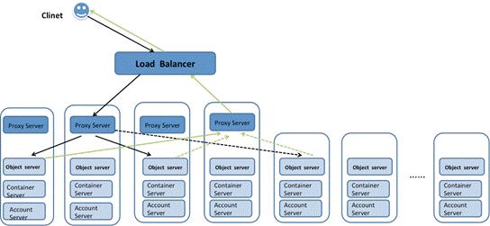 假设设备损坏的概率为 2%,以上三种存储策略的数据持久性分别为:99.9995%,99.9992%与 99.96%。 表 1为存储策略的应用 Swift 集群的总结点数量为 54 个节点,总容量约为 2.3PB,集群的部署架构如下图所示,其中 Proxy Server 的数量可根据需要增加或者减少。采用传统三副本方案,能够保存的视频总长度约为(同一段视频不同分辨率不进行重复统计)3.97×106 分钟。 采用上述存储策略后,保存的视频总长度为 5.89×106 分钟,存储效率提高了 48%。 图12所示为基于 Swift 的视频存储系统的部署架构 图12 五、结束语 在大数据时代,随着文件数量和阿里云数据体量的增加,文件系统与 NAS 的瓶颈越来越明显,基于 RESTful Web API 的对象存储逐渐受到人们的广泛接受。作为最具代表性,应用最广泛的开源对象存储方案,OpenStack Swift 自诞生以来一直保持着技术上领先的地位,在 Swift 2.0 中推出的存储策略功能,能够让管理员根据自己系统的特点制定不同的存储策略;用户或租户根据自己阿里云数据的特点和业务需要,以 Container 为粒度选择存储策略,从而实现成本、数据可靠性、性能等维度上的综合权衡和优化,体现了软件定义存储的特点。本文只是对存储策略做了一个简要的介绍,让读 者体会存储策略的用途,进一步深入探索可以查看参考资料了解有关 OpenStack Swift 的更多相关信息。 上一条: 2015年云计算发展的八大趋势