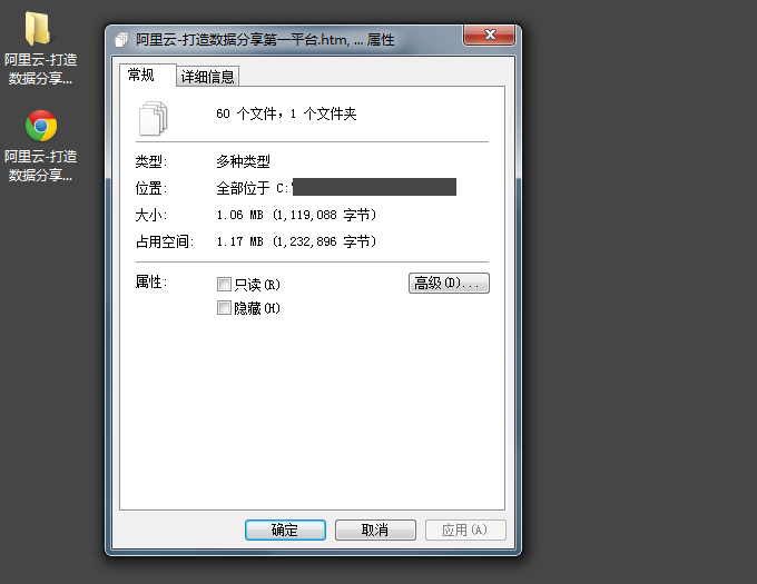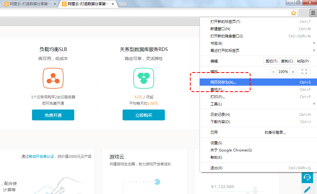 网站首页大小该如何查看 这里以Google的chrome浏览器为例子,来查看阿里云官网首页的大小:http://www.aliyun.com/ 1)找到网页另存为,如图: 2)然后选择文件名和类型,保存,如下图: 3)再打开保存文件所在的目录,如图: 4) 选择刚才保存的文件与其对应的文件夹,点鼠标右键查看其属性,如图1.06MB,这个就是我们整个页面保存下来的大小。 下一条: 云服务器密码重置(原密码修改)