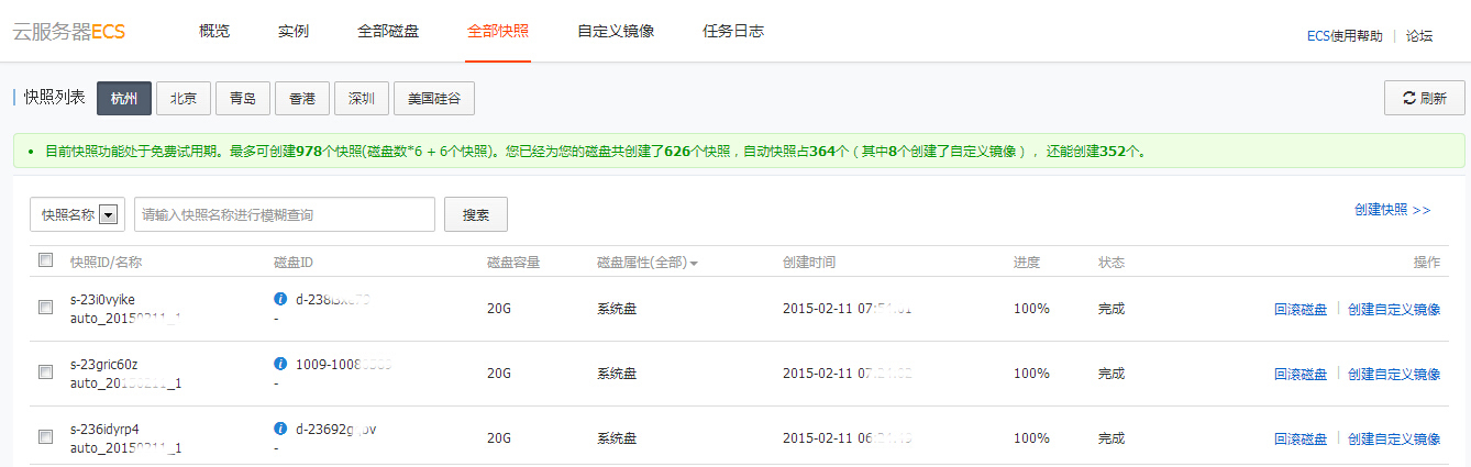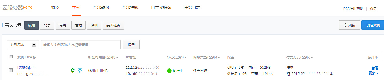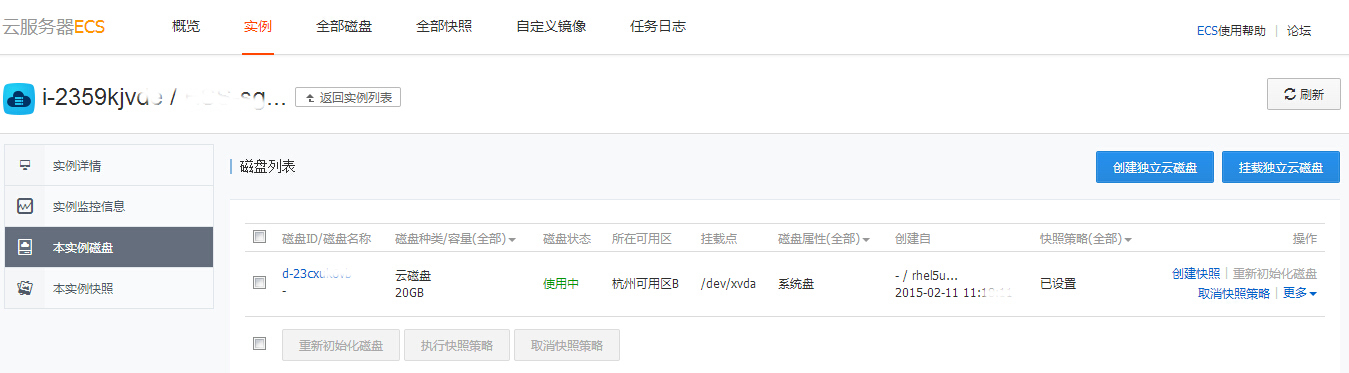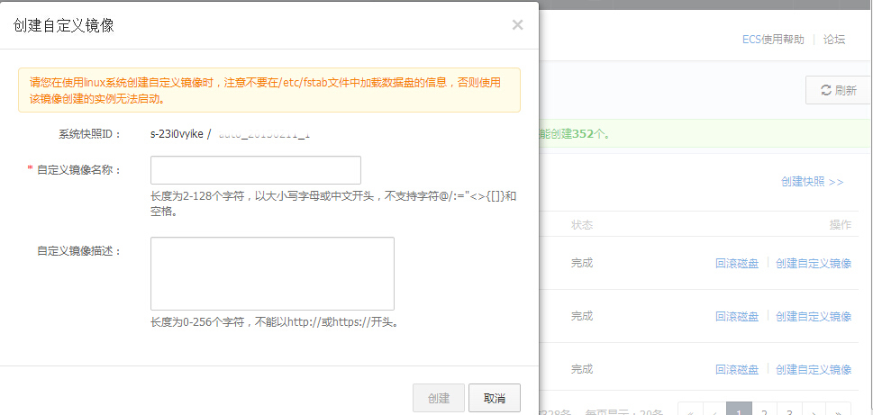 通过镜像快速创建ECS新服务器 为帮助客户快速部署,可以使用通过镜像创建新服务器功能可以,具体操作步骤如下: 1. 先客户登陆ECS控制台https://console.aliyun.com/ecs/index.htm,点击【实例】,之后点击后面操作项中的【管理】按钮, 2. 在新页面点击【本实例磁盘】,并且点击实例后面的【创建快照】按钮, 注意:若有数据盘,则数据盘也需要创建快照 3. 快照创建完毕后,点击页面上方的【全部快照】并且找到刚刚创建的快照名称,在对应快照ID后面点击【创建自定义镜像】, 4. 按照相应的规则输入镜像名称后再点击创建, 创建好自定义镜像后,请回到云服务器购买页面https://buy.aliyun.com,选择好服务器所在区域节点,CPU、内存配置后,镜像类型请选择【自定义镜像】,并且在下拉菜单中找到刚刚创建的自定义镜像,数据盘选择【用快照创建磁盘】并且选择刚刚创建的数据盘快照,设置好密码后,在页面上点击【立即购买】就完成了。 若问题还未得到解决,请联系售后技术支持。 上一条: 如何处理因恶意扫描被封禁的问题