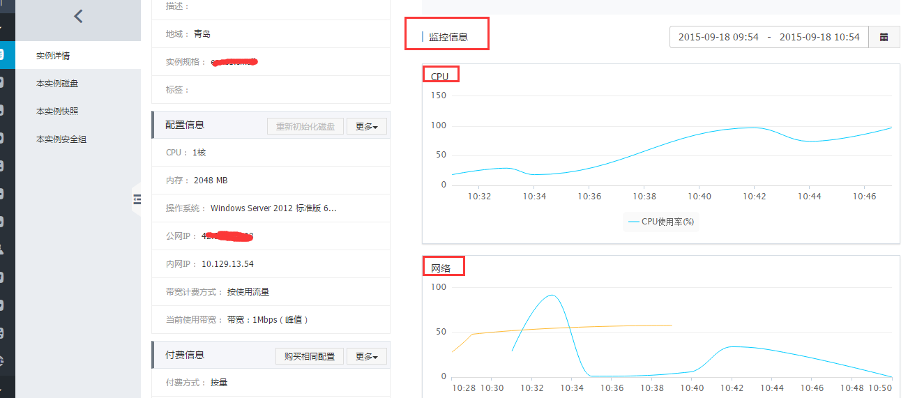 阿里云ECS控制台中实例监控信息说明 云服务器ECS控制台中实例监控信息说明: 在云服务器ECS控制台中,可以查看到最近30分钟、6小时、1天、1周的CPU,网络带宽与磁盘IO监控数据。 查看方法:阿里云控制台首页--选择【云服务器 ECS】--选择【服务器所在地域】--择对应的服务器--点击进入【管理】--查看【监控信息】。 网络:显示的监控数据是服务器的公网流量,单位是kbps,1M带宽=1024kbps。监控数据可以查看出服务器和入服务器两个方向的流量。1M的带宽,出网流量达到1024kbps,带宽基本就是跑满了。 CPU:显示的监控数据即为服务器CPU使用的百分比,百分比越高,说明服务器CPU的负载越高。Windows系统的服务器可以在服务器上用“任务管理器”来查看CPU的使用情况,按CPU排序,可以找出是什么程序占用服务器的CPU资源。 Linux系统的服务器通过top命令查看CPU的使用情况,登录服务器,在命令行执行命令top,然后键盘输入shift+p,让top按CPU使用大小排序,可以查看目前占用CPU的进程。 如问题还未解决,请联系售后技术支持。 上一条: ECS是否支持添加硬件加密狗等外置设备