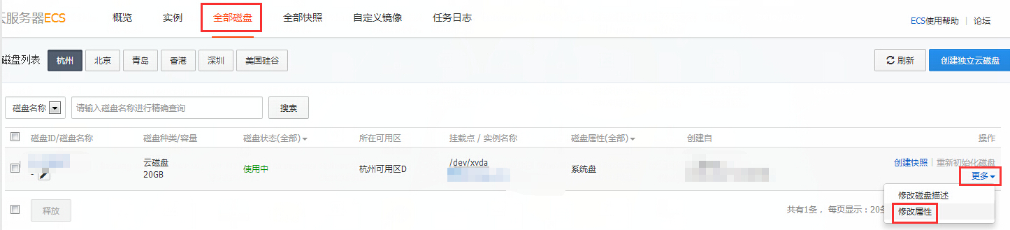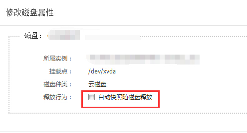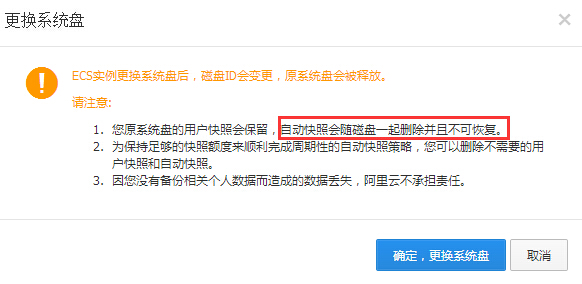 ECS设置自动快照不随更换系统盘而丢失的方法 更换系统盘时默认是保留用户手工创建的快照,但是自动快照会随磁盘系统的更换而删除。提示如下: 如果更换系统盘时不让自动创建的快照随之释放,需要进行如下操作: 1、在ECS管理控制台中点击【全部磁盘】->【更多】->【修改属性】。 2、将【释放行为】取消掉【自动快照随磁盘释放】的勾选。 经过这样操作后,系统盘更换系统盘老系统的自动快照也不会丢失。 注:之前磁盘的快照仅能用于创建自定义镜像,是不能直接用于回滚的。 如问题还未解决,请联系售后技术支持。 上一条: 阿里云ECS控制台中实例监控信息说明 下一条: 如何查询与定位IP地址