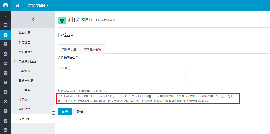 关于RDS控制台白名单配置简介 RDS默认没有设置白名单控制,建议仅将您的WEB服务器外网IP/IP段设为可访问权限,否则数据库将会有高安全风险。 配置概要介绍: 登录管理控制台; 打开RDS控制台; 点击对应地域下需要配置的相应实例名称; 点击左侧功能树中的【安全控制】,如下图所示; 设置访问白名单。有几种方式: 1、手动修改: 点击该按钮后,可以手工输入需要设置的白名单。支持格式如:0.0.0.0/0,10.23.12.24(IP),10.23.12.24/24(CIDR模式,无类域间路由,/24代表了地址中前缀的长度,范围[1,32])。其中 "0.0.0.0/0和空"代表不设IP访问的限制,但我们建议仅将您的WEB服务器外网IP/IP段设为可访问权限,要不然数据库将会有高安全风险。数据以逗号隔开,不能够重复,最多1000个。 2、将白名单复制到其他实例: 如果名下有多个实例,使用该选项可以将相关策略快速负责到其他实例,这样能提高配置效率。 3、加载ECS内网IP添加: 点击该按钮后,可以按需勾选名下ECS的内网IP,自动生成策略; 如问题还未解决,请联系售后技术支持。